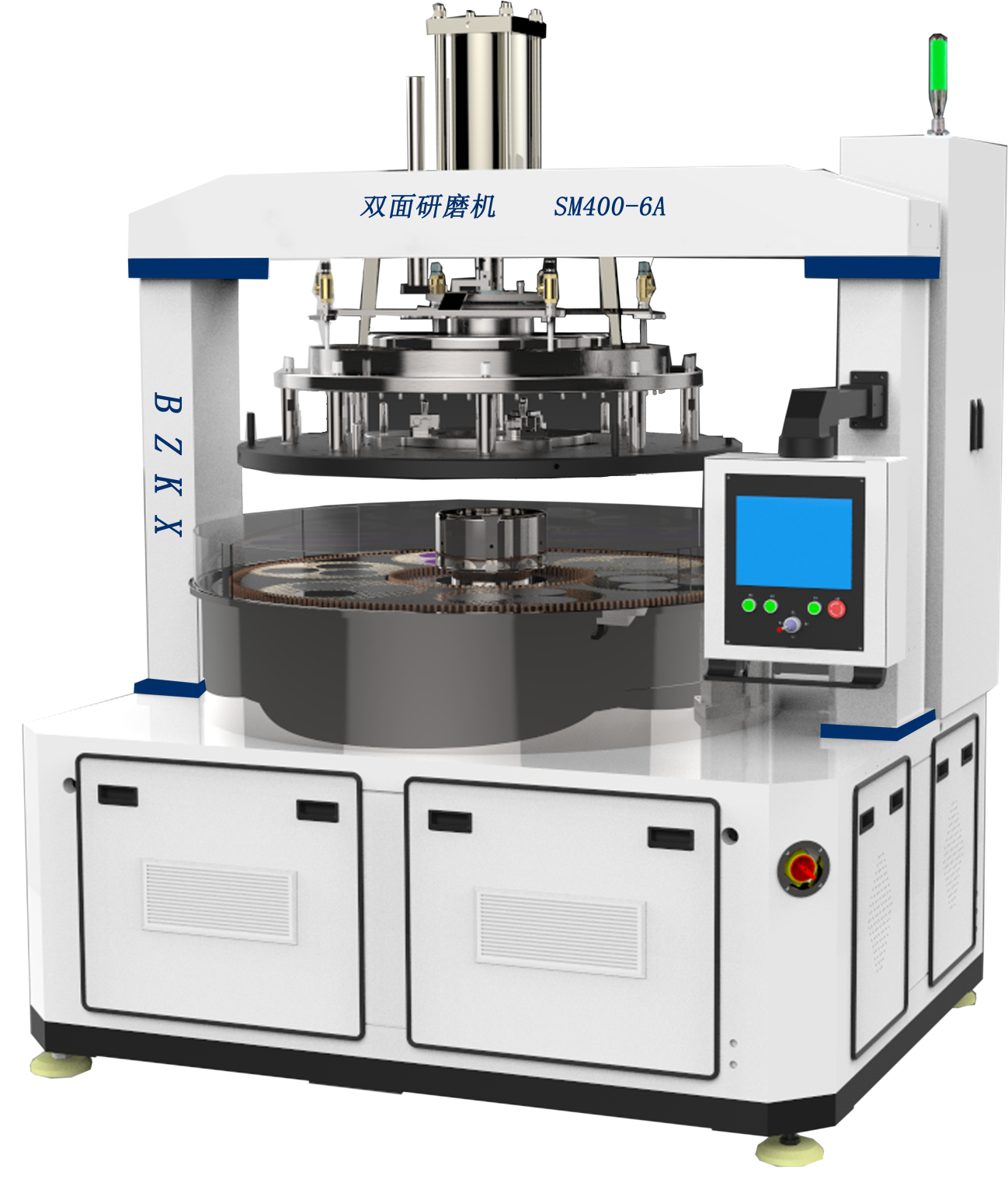 本機型為四電機拖動的 18B 雙面研磨設備,可裝載 9 個 13B 的游星輪,主要用于碳化硅、藍寶石、砷化鎵、陶瓷片、晶體、半導體等硬脆材料平行平面的高精度雙面研磨加工,也可用于手機面板玻璃、車載玻璃及各種觸摸屏面板的雙面研磨加工;尤其對于大直徑、超薄工件的加工具有明顯的優勢。